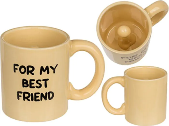 Amuzament garantat la fiecare înghițitură! Cana din ceramică cu un finisaj strălucitor ascunde la fund o figura inedită în formă de penis și un mesaj jucăuș "For my best friend". Este creată ca un cadou original sau ca o glumă care va stârni hohote de râs.
