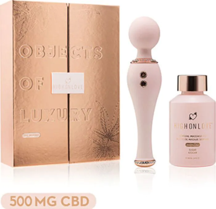 Răsfăț muzical cu masaj profund și ulei nutritiv! Kitul Objects of Luxury de la High On Love include un masajer wand din silicon moale și 100% rezistent la apă, precum și un ulei de masaj cu 500 mg de CBD, ideal pentru relaxare.