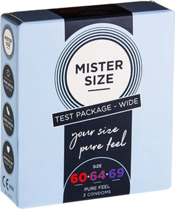 Ajustare confortabilă și senzație naturală cu prezervativele Mister Size. Acestea sunt fabricate din latex de cauciuc natural, având un grosime de 0,06 mm, ce permite o sensibilitate crescută. Disponibile în dimensiunile 60, 64 și 69 mm, ele se adaptează perfect nevoilor tale.