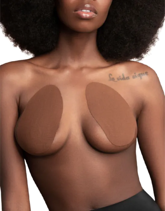 Aplică protecția pentru mamelon pe areolă și fixează banda adezivă în partea de jos a sânului pentru un efect de ridicare eficient. Repetă procesul pe celălalt sân. Pentru o fixare mai bună, asigură-te că pielea este curată și uscată înainte de utilizare.