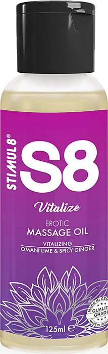 Uleiul de masaj STIMUL8 S8 Vitalize oferă o aromă citrică și picantă, ideal pentru a hidrata pielea și pentru a îmbunătăți experiența masajului.